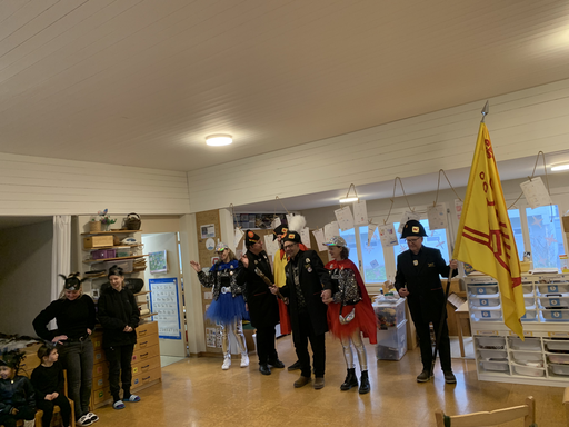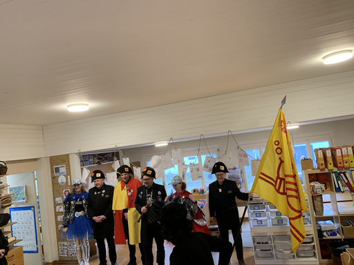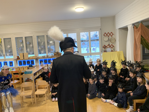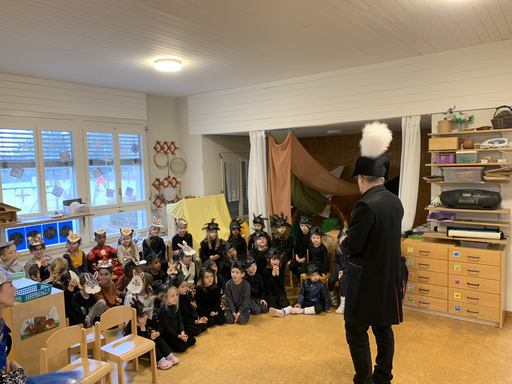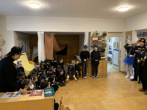 Ein fasnächtlicher Anlass steht bevor. Der Besuch der Egli Zunft im Kindergarten! Gespannt warten die schwarzen Raben vor dem Kindergarten und krähen vor Freude, als sie die Fahne der Egli-Zunft erblicken.