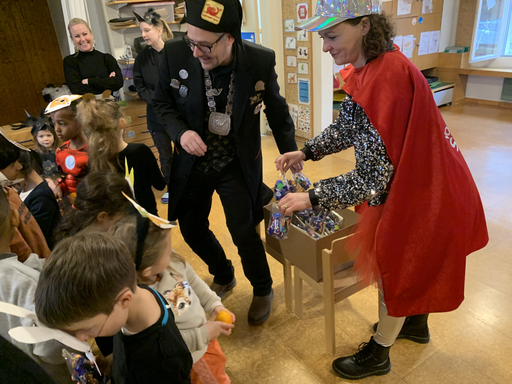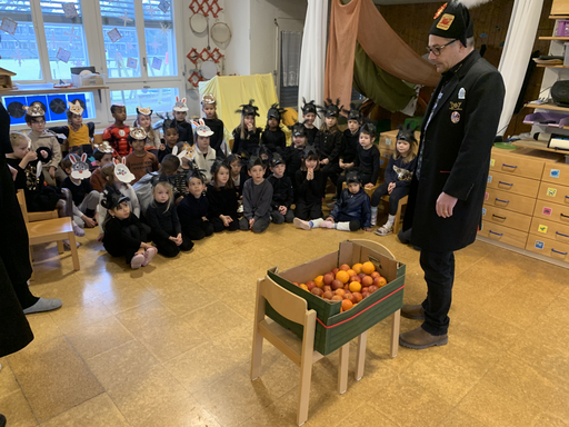 Stolz kommt die Egli-Zunft in den Kindergarten und begrüsst die freudige Kinderschar. Mit einem Waldtierlied präsentieren die Raben der Zunft die Tiere des Waldes. Anschliessend stellt die Egli-Zunft sich selbst vor und beschenkt die Kinder mit Vitaminen und Süssem für die Fasnachtszeit.
