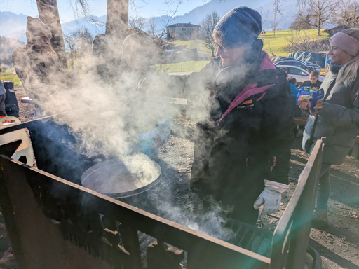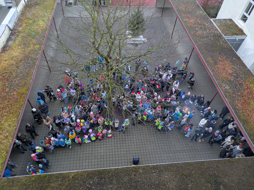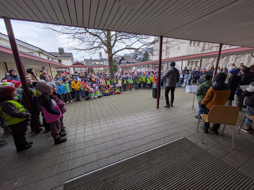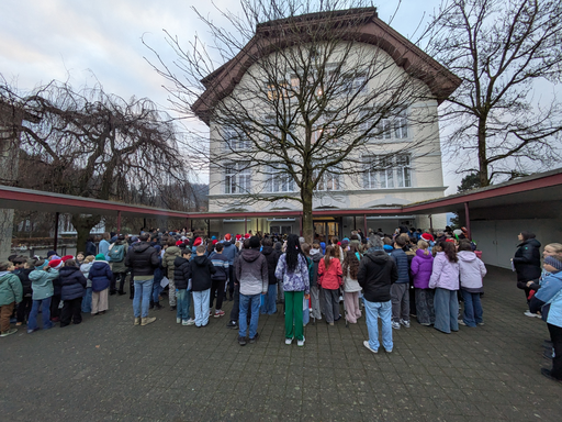 Am letzten Schultag durften alle draussen dem Konzert der Bläserklasse zuhören und danach gemeinsam Weihnachtslieder singen. Die Freude auf die Ferien war gut zu erkennen: Viele Kinder trugen Samichlaus-Mützen und anderen Weihnachtsschmuck, und unser Hauswart machte ein kleines Feuer in einer Feuerschale.