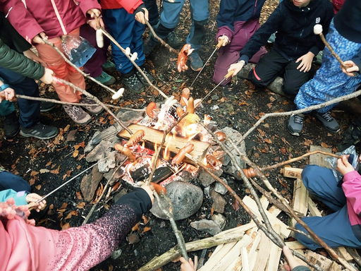 Oben angekommen, trafen sich alle Klassen wieder. Gemeinsam wurde gebrätelt, gespielt und geplaudert. Das mitgebrachte Stück Holz kam beim Feuer gut zum Einsatz, und bald duftete es überall nach Würsten, Mar und Schlangenbrot.