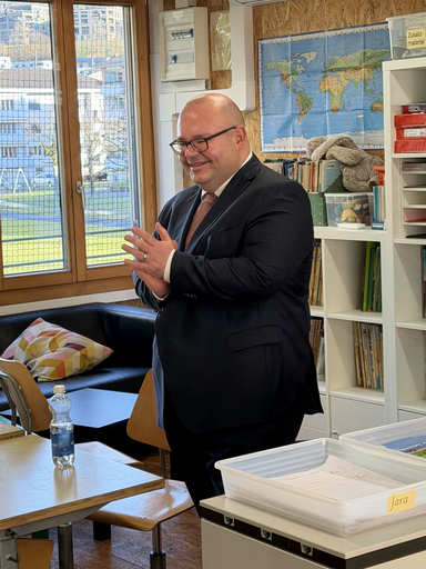 Bei anschliessenden Unterrichtsbesuchen in einer 4. Primarklasse im Schulhaus Allmend sowie in einer 2. Sekundarklasse Niveau C im Schulhaus Zentrum erhielt Regierungsrat Hartmann einen direkten Einblick in unseren lebendigen Schulalltag.