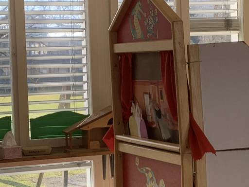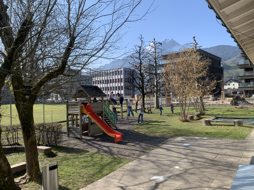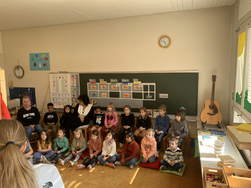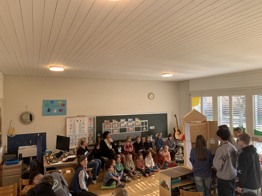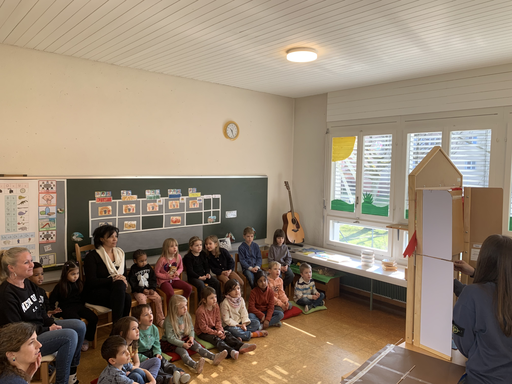 Im Kindergarten wurde eine Bühne aufgebaut und die Figuren bereit gemacht. Gespannt lauschten die Kindergartenkinder den Jugendlichen. Anschliessend genoss man gemeinsam noch die Sonnenstrahlen auf dem Kindergartenspielplatz, bis sich die Klasse C2c verabschiedete und wieder ins Oberstufenschulhaus zurückging.