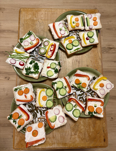 Wir schnippselten das Gemüse in mundgerechte Stücke, bestrichen die Toastscheiben mit Frischkäse und belegten diese danach mit lustigen Gesichtern. Passend zur Fasnacht!