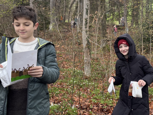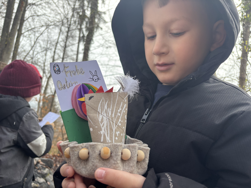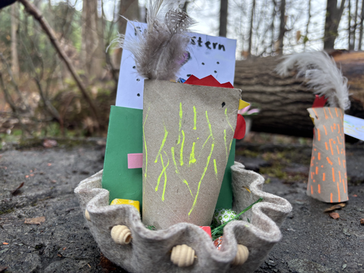 Ostern steht vor der Tür. Als die Patenklassen sich auf den Weg zur Osternestsuche in den Wald begaben, fielen dicke Schneeflocken vom Himmel.