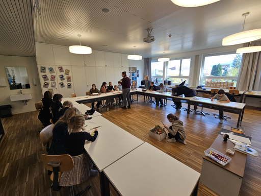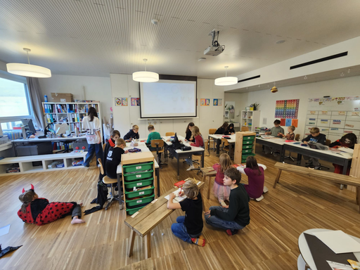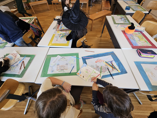 Zurück im Schulzimmer lasen die Gruppen ihre spezielle Halloween-Geschichte, die sie mit vielen witzigen Ideen vervollständigten. In Zweierteams entstanden fantasievolle Bilder, die am Ende zu einem grossen Leporello-Bilderbuch zusammengesetzt wurden. Besonders schön war zu sehen, wie die älteren Kinder die jüngeren unterstützten und gemeinsam tolle Ergebnisse erzielten.